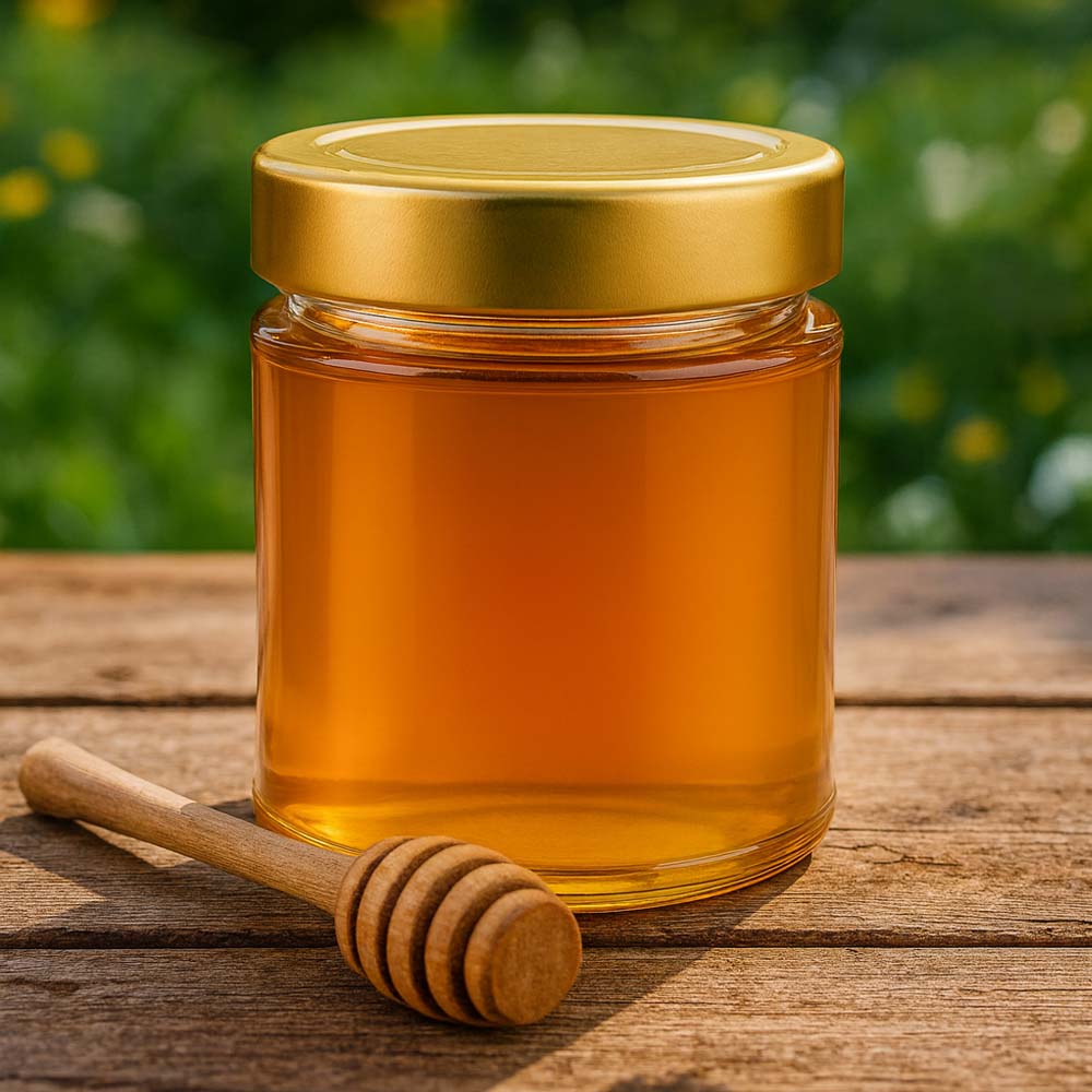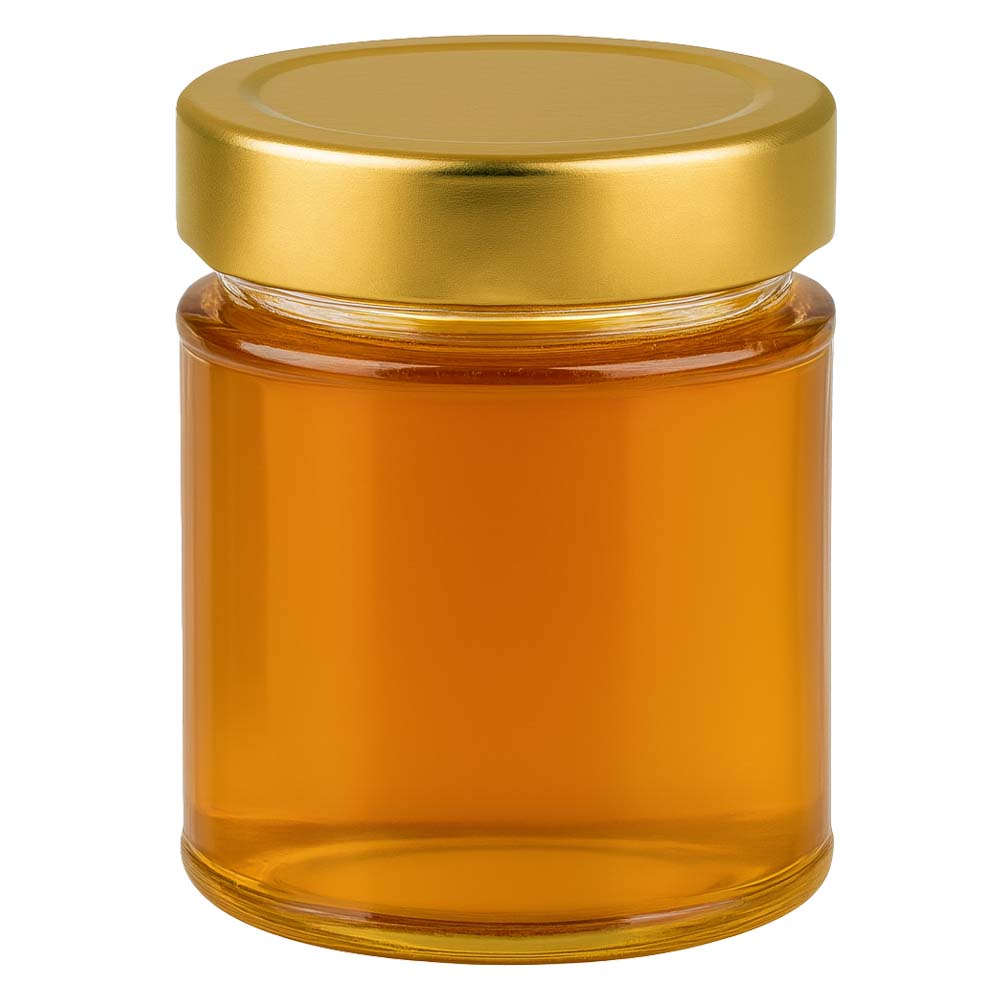 Hochwertiges 200 g Honigglas mit elegantem goldenem Deckel BasicSeal UNiTWIST. Ideal für die Vermarktung größerer Honigportionen, Geschenksets und hochwertige Präsentationen. Das Glas überzeugt durch seine stabile Qualität und den sicher dichten Verschluss.