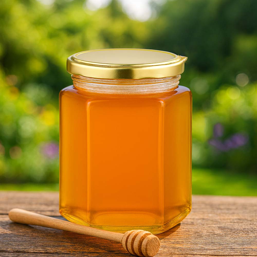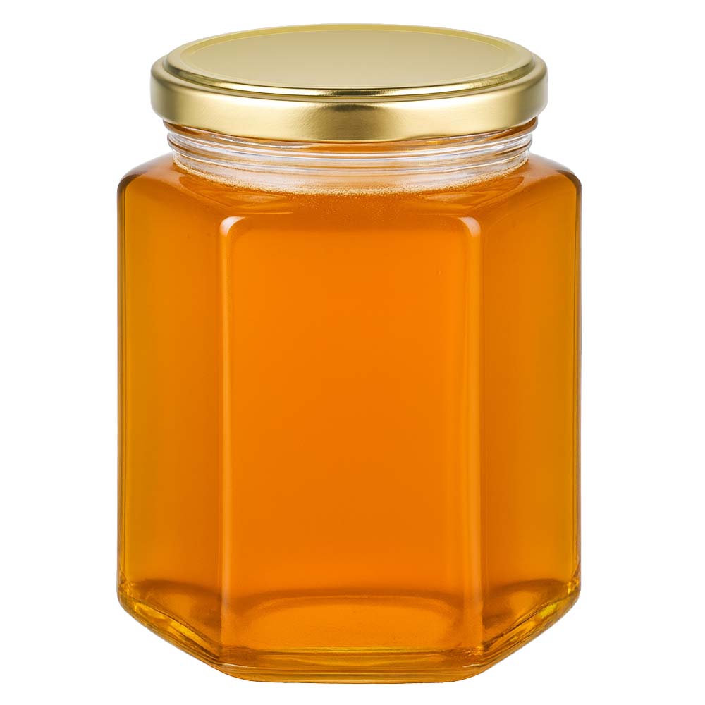 Hochwertiges 250 g Honigglas mit elegantem goldenem Deckel BasicSeal UNiTWIST. Perfekt für die professionelle Abfüllung, den Verkauf ab Hof und ansprechende Geschenkverpackungen. Das robuste Glas und der sichere Schraubdeckel sorgen für eine dichte und zuverlässige Lagerung.
