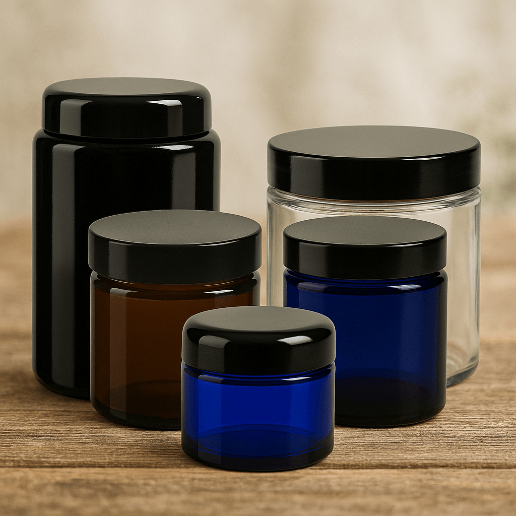 Glastiegel in Blau, Braun, Klar oder Violett - Grössen 15-500ml