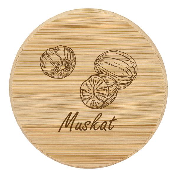 - Aufdruck: Brauner Schriftzug und Bild "Muskat"