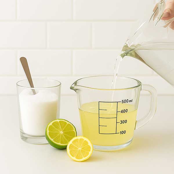 → Wichtig: Nicht über 60 °C erhitzen, da sonst Kalziumcitrat entstehen kann, das schlechter löslich ist.